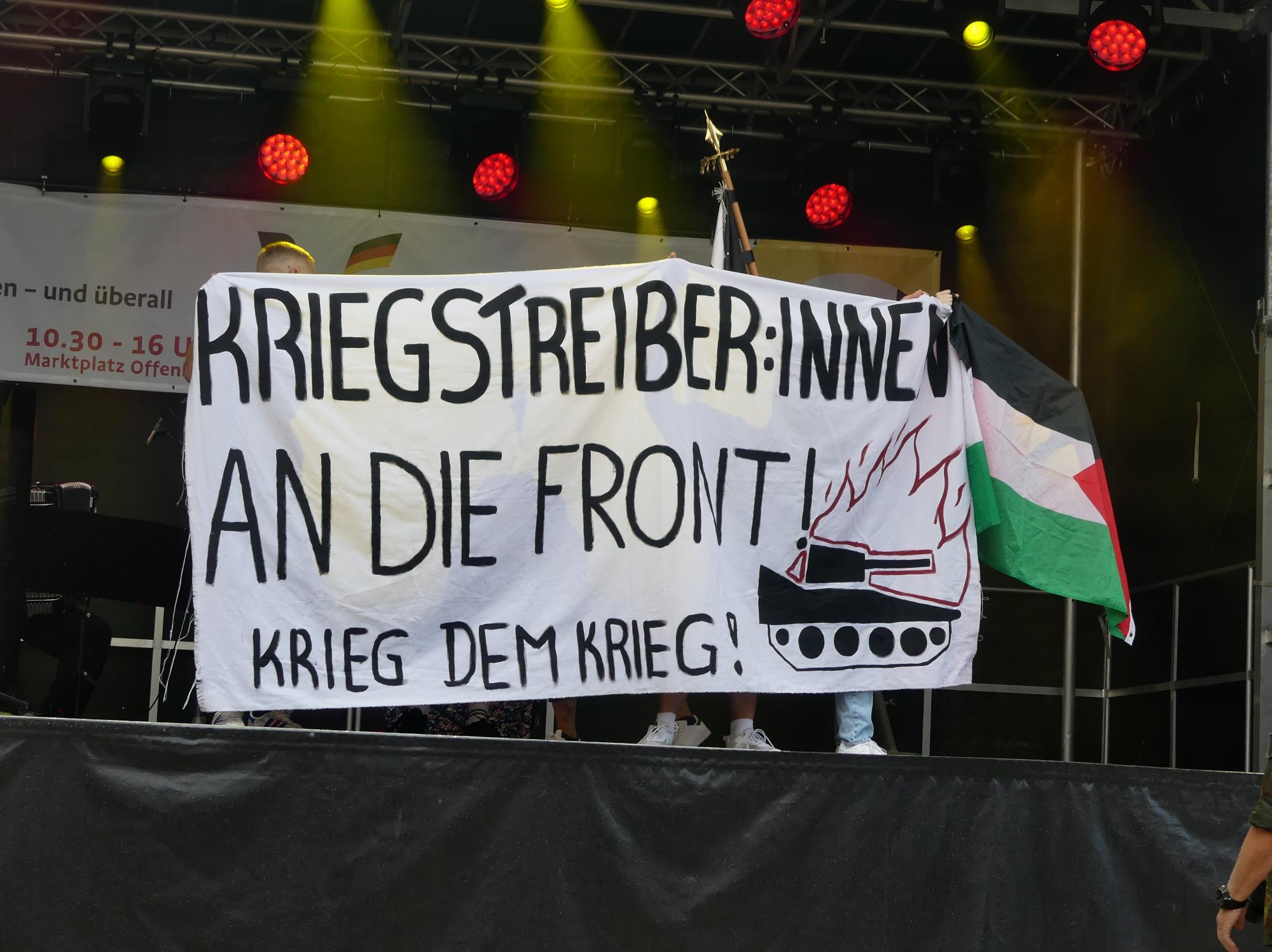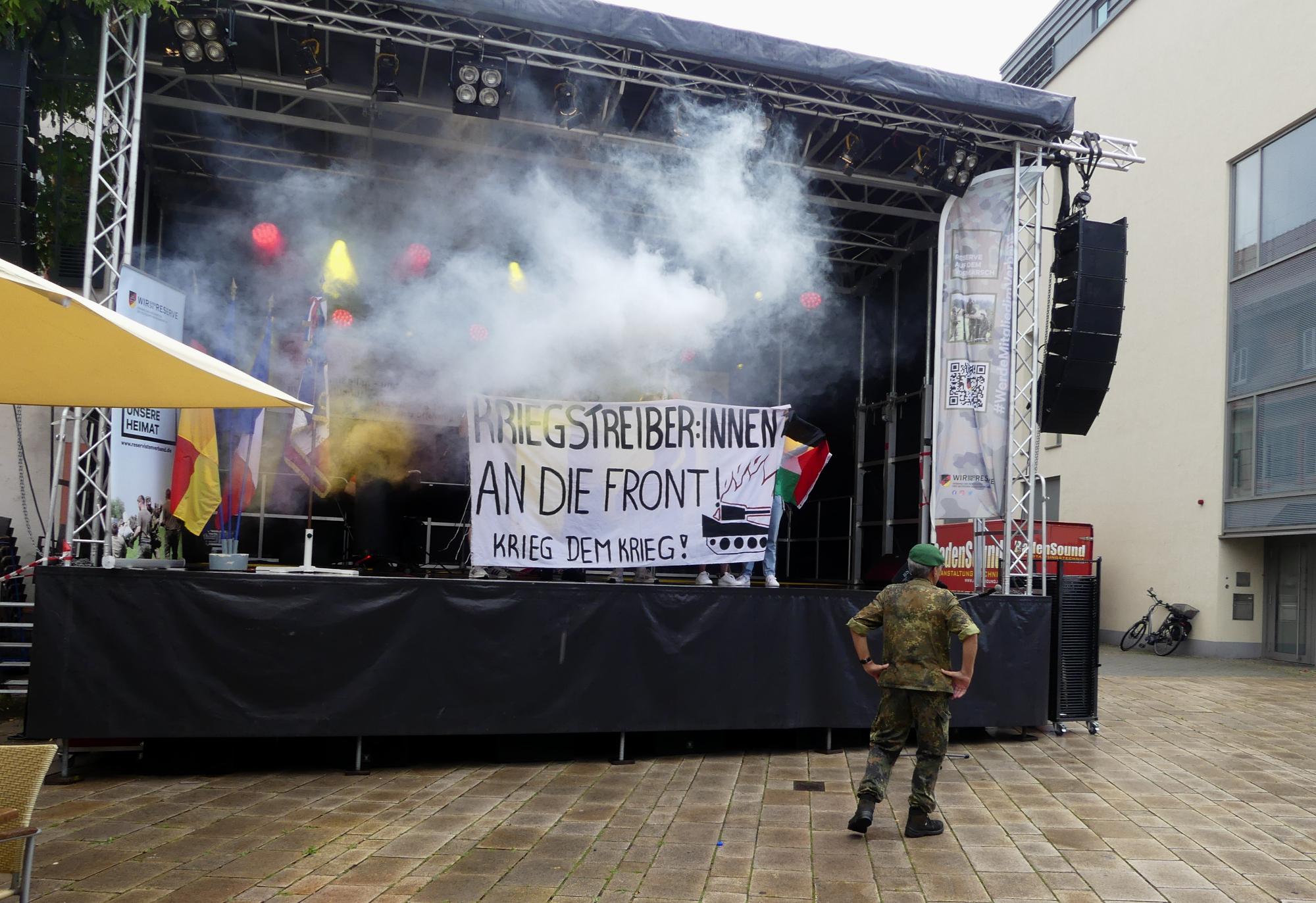 "In Offenburg störten Antimilitarist:innen erfolgreich den „Veteranentag“, der auf dem Marktplatz der Stadt abgehalten wurde. Kurzzeitig wurde die Bühne geentert, mit aufgespanntem Transparent und etwas Pyro das Programm unterbrochen und auch mit Palästina-Fahne Haltung gezeigt - Solidarität mit den Menschen in Palästina und gegen die Unterstützung des Genozids in Gaza durch die BRD. Nachdem Security und Reservisten gemeinsam die Bühne zurückerobert hatten, störten kurz darauf an anderer Stelle weitere Antimilitarist:innen die gerade beginnende Technikschau. |