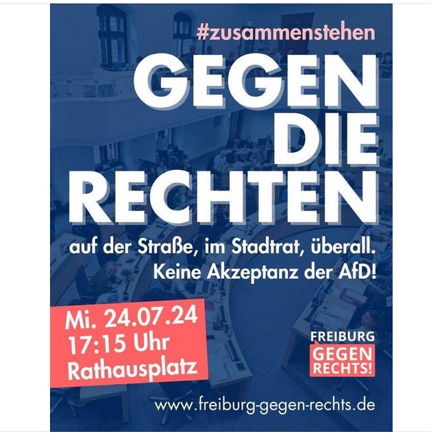 Auf der Straße, im Stadtrat, überall: Keine Akzeptanz der AfD! Am 24.07.2024 ist die konstituierende Sitzung des neuen Gemeinderats in Freiburg. Obwohl die AfD in Freiburg entgegen den Erwartungen ihr Wahlergebnis von 2018 nicht signifikant verbessern konnte, ist sie erneut mit zwei Mandaten vertreten. Zwar wird derzeit eine Zusammenarbeit mit der AfD im Gemeinderat noch fraktionsübergreifend ausgeschlossen, dennoch bedeutet der Wiedereinzug der AfD, dass diese den Gemeinderat weiterhin für sich als Bühne nutzen, den öffentlichen Diskurs beeinflussen und sich somit auch in Freiburg weiter etablieren kann. Das dürfen wir nicht unwidersprochen hinnehmen. |