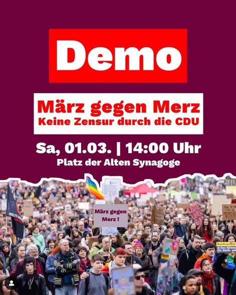 Am Samstag 1. März um 14 Uhr veranstalten wir am Platz der alten Synagoge eine Demo gegen die Zensur durch die CDU.